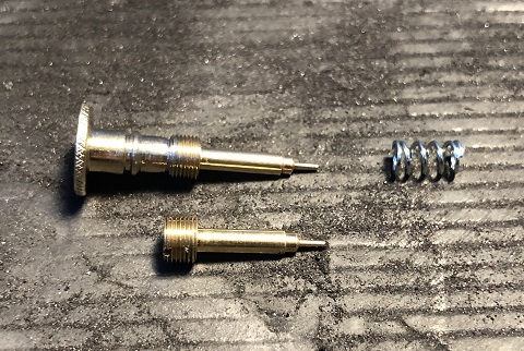 Hier ein Foto von meiner Eigenbau-Einstellschraube. Die Originalschraube sitzt unter einer Plombe, die man erst ausbohren muss, vorne unten am Vergaser. Selbst mit ausgebohrter Plombe kommt man nicht dran, um das Gemisch einzustellen. Daher die verlängerte Schraube, damit kann man einfach unterwegs das Gemisch nachregeln.