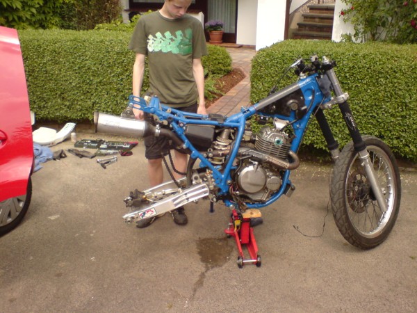 Montageständer, Rad raus, Gabelrohre raus, plus Hinterrad evtl noch Koti hinten und Endtopf ab