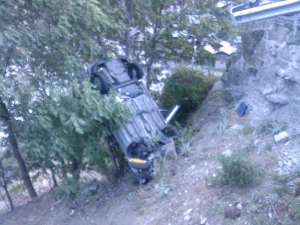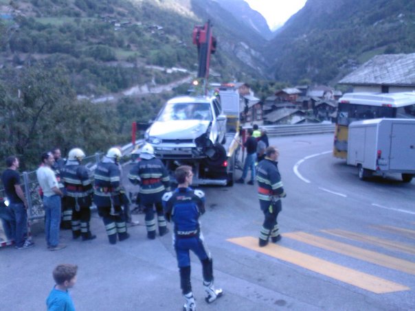 Kurz vor einer 180° Kurve überholt ein Motorradfahrer über die durchgezogene Mittellinie, der Fahrer des holländischen Autos zieht vor Schreck nach rechts, kracht mit dem Rad gegen den Bordstein und verliert die Kontrolle über sein Fahrzeug, welches geradewegs in die Leitplanke donnert, sie durchschläg und zum großen Glück an ein paar Bäumen hängen bleibt.
