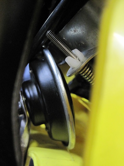 8. halteblech und ein kleines roehrchen als abstandshalter gefertigt, gummituelle einer kabeldurchfuehrung zweckentfremdet (das roehrchen muss unbedingt mit montiert werden, ansonsten hoert sich du hupe wie ein blecheimer an; liegt wohl daran das der hupenkoerper frei schwingen muss um einen vernuenftigen ton zu erzeugen)