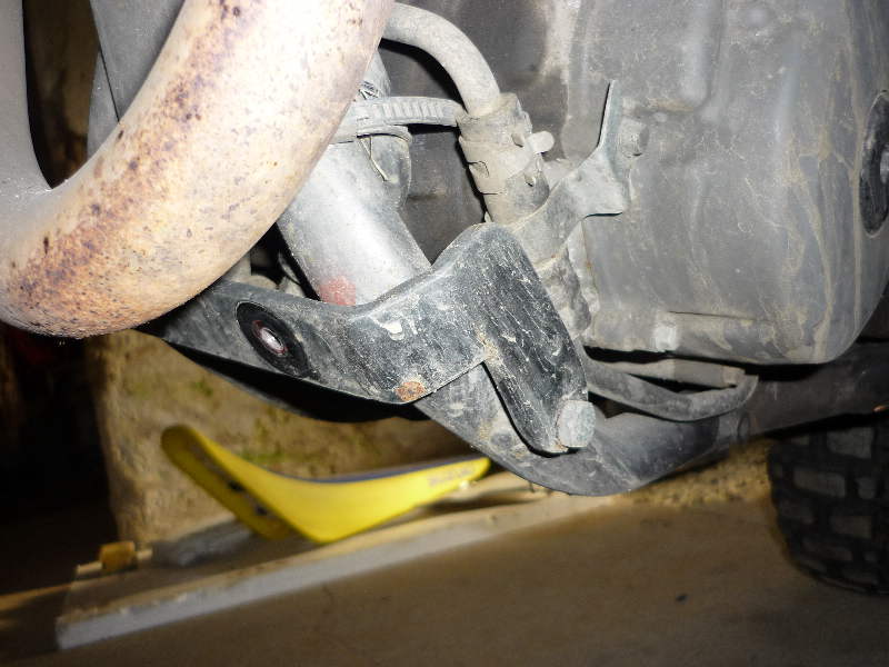 Hinten hab ich ein zusätzliches Loch in den Motorschutz gebohrt und das Originalgewinde am Rahmen verwendet und aus Alu eine Distanzhülse gebastelt.Auch hier einen Gummi verwenden