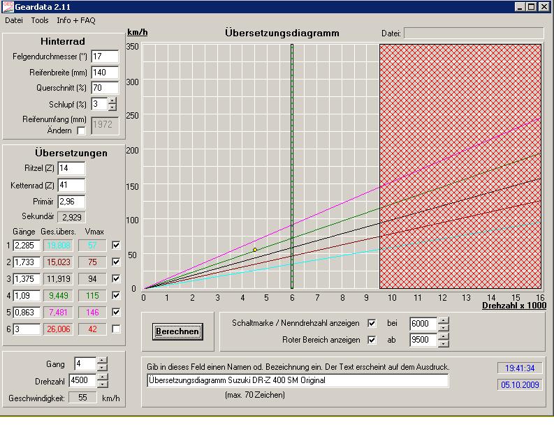 fahre derzeit mit der Original-Übersetzung (und Originalbereifung). Möchte eventuell zu 15/44 wechseln oder so. Das Programm GEARDATA funzt bei mir irgendwie einfach nicht. Hab´s schon ziegmal probiert.