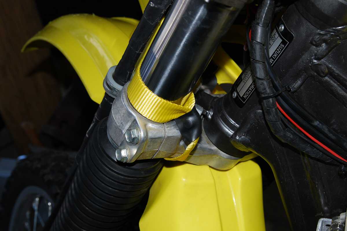 nimm nen alten Rolladengurt (ist besser zu greifen) und mach den vorne unter der unteren Gabelbrücke beideitig nach oben und vor dem Lenkkopf zusammen. Hinten hab ich das rechts und links unter dem Heckrahmen durchgeführt. Vorne und hinten hab ich geknotet und den Knoten mit Kabelbinder gesichert.