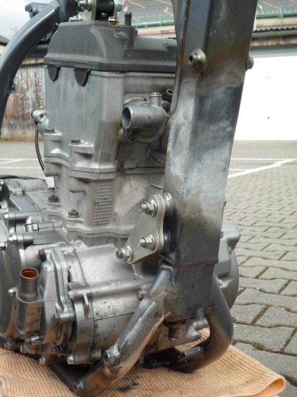 Nachdem ich im Januar die Zette endlich zerlegen konnte, ging der Rahmen erst mal zum Richten in eine Rahmenrichtwerkstatt hier in der Nähe. Nach langem Warten ist er nun wieder da! :D Außer dem eigentlichen Richten mußte noch der rechte Unterzug geschweißt werden (war eingedrückt) und die beiden Fußrastenaufnahmen und die Seitenständerhalterung wieder gerade gebogen werden. Dazu war der Einbau des Motors (wegen Rahmen) und der Räder (wegen Seitenständer) nötig. Am Tank wurde die linke obere Halterung des Kühlerspoilers gerichtet.